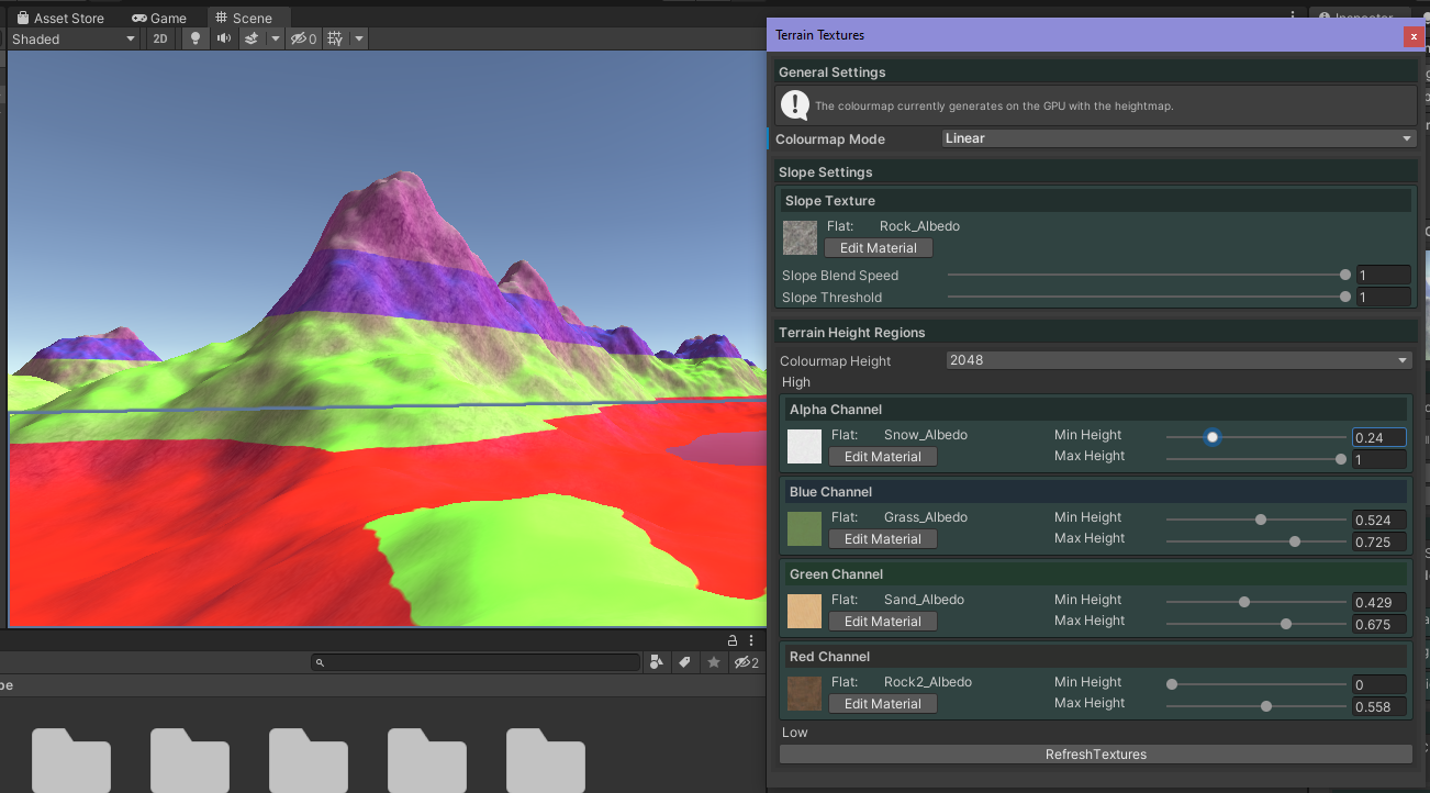 Though the terrain was planned to support PBR textures, I didn't have time to write such a shader, thus only the albedo map for each material is applicable.